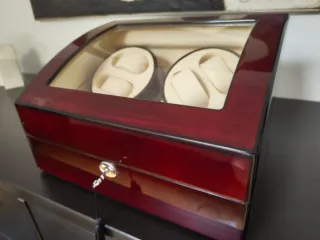 Estuche para guardar y dar cuerda a relojes automáticos. Con un acabado brillante y elegante. Color caoba. - Capacidad para dos relojes. - Interior forrado en material suave. - Tapa transparente para ver los relojes. - Marcas de desgaste que se aprecian en la foto