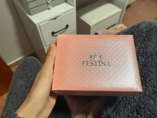 Elegante reloj Festina con detalles en dorado y una pulsera adicional de Viceroy. Incluye su joyero original para guardarlo. - Bisel adornado con pequeñas piedras. - Esfera con detalles en relieve y números romanos. - Pulsera de eslabones dorados.