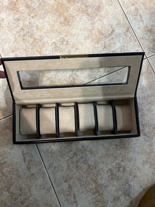 Elegante estuche para guardar y exhibir hasta 12 relojes. Su diseño combina exterior negro con interior beige, ofreciendo un acabado sofisticado. Caja de almacenamiento para reloj. Nueva a estrenar. No acepto devolución. - Capacidad para 12 relojes. - Ventana transparente en la tapa para visualización. - Compartimentos individuales para proteger cada reloj.