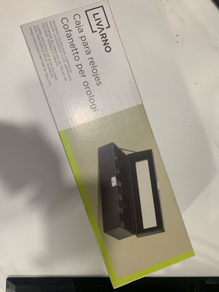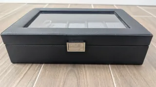 Elegante organizador para relojes con espacio para 10 unidades. Su tapa transparente permite ver la colección. Usado una vez - Diseño moderno en negro. - Compartimentos individuales para cada reloj. - Forro interior suave para proteger los relojes. - Cierre de seguridad.