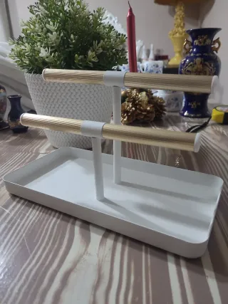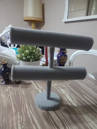 Elegante soporte de dos niveles para organizar y exhibir tus pulseras y relojes. En terciopelo gris con remates brillantes. - Diseño de dos barras horizontales. - Base redonda estable. - Acabado en color gris con detalles plateados. *136