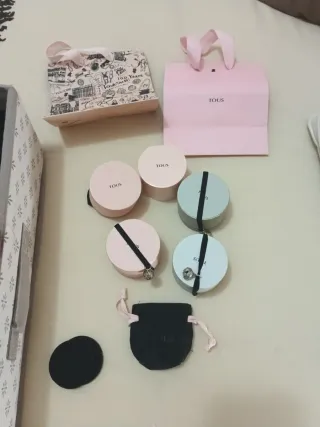 Se vende conjunto de cajas para joyas de la marca Tous.originales. Se venden individual o en pack. Incluye varias cajas redondas de diferentes tamaños y colores, junto con dos bolsitas de tela negra para guardar accesorios. - Cajas redondas en tonos rosa y verde. - Cierre con cinta negra. - Incluye dos bolsitas de tela negra con cordón.