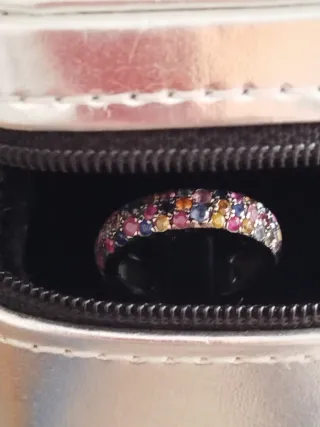 Déjate llevar por la belleza de los zafiros multicolor de esta sortija y combínalos con el toque *grunge* de la plata pavonada. Una combinación perfecta. Media alianza TOUS Fantasy en plata de primera ley y zafiros multicolor. Talla 54. Envío en cajita joyero Tous. Precioso anillo descatalogado y de edición limitada..