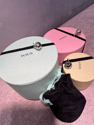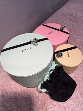 Conjunto de tres cajas de regalo de la marca Tous. Ideales para guardar joyas o pequeños objetos. - Caja redonda grande color verde menta. - Caja redonda mediana color rosa. - Caja redonda pequeña color beige. - Incluye una bolsita de tela negra con cordón.