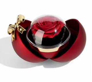 Este joyero tiene la forma de una rosa con un tallo verde. - Diseño de rosa. - Acabado metálico.