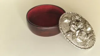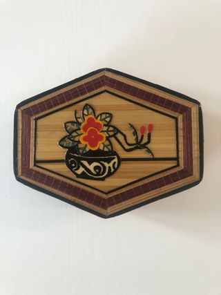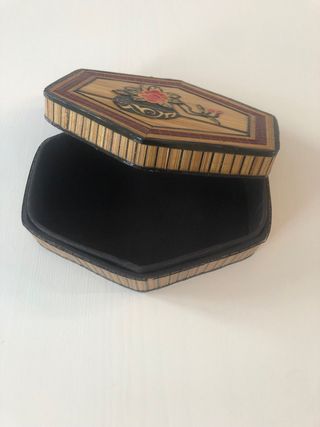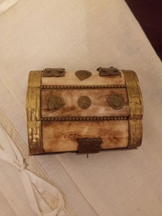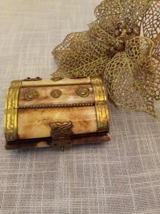 Preciosa caja joyero de estilo artesanal. Es pequeña y compacta, ideal para guardar pequeñas joyas - Tiene aplicaciones en latón - Forrada en terciopelo - Perfecta para regalo o uso personal. - Tamaño largo 9 cm y alto 4 cm Tienes más objetos decorativos así como ropa para hacer bonitos looks en mi perfil