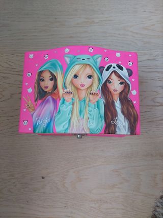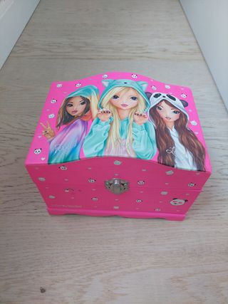 Precioso joyero musical de la marca TopModel. Es de color rosa y multicolor, con un diseño muy bonito. Pequeña muesca en el espejo. - Ideal para guardar pequeños objetos de valor. - Perfecto para regalar a una persona especial. - Decorativo y funcional.