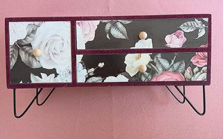 Bonito joyero con tres cajones y un precioso estampado floral. En su otros tres lados está forrado de tejido aterciopelado en color morado intenso. Ideal para guardar joyas y pequeños objetos. Medidas 31x15x13 cm.