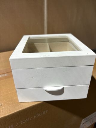 Elegante joyero de Zara Home con compartimentos para organizar tus accesorios. - Diseño de madera lacada en blanco. - Tapa con cristal. - Cajón inferior. - Interior forrado en tela.