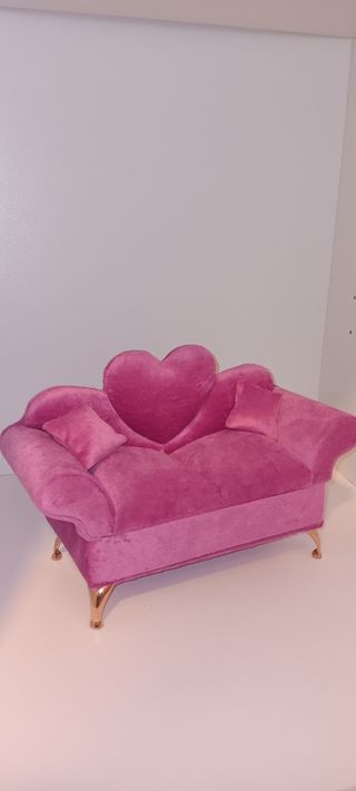 Este encantador sofá joyero en color rosa es perfecto para organizar tus accesorios. - Diseño con forma de corazón en el respaldo. - Incluye dos cojines pequeños. - Patas metálicas en tono dorado.