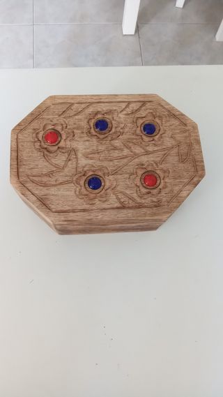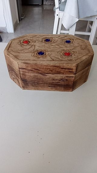 Bonito joyero de madera con un diseño octogonal y tallado floral. - Tapa con motivos florales. - Incrustaciones de piedras azules y rojas. - Acabado en madera natural. -Medidas 25 cm largo X 18 cm ancho