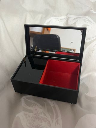 Elegante caja joyero con un diseño floral y mariposa. - Acabado exterior negro brillante. - Decoración floral y de mariposa. - Incluye espejo interior. - Mecanismo musical.