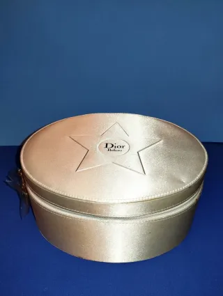 Elegante neceser joyero de la marca Dior. Su diseño circular y acabado satinado lo hacen perfecto para guardar tus accesorios más preciados. - Diseño con estrella grabada. - Cierre de cremallera. - cojín interior. Tiene algunas pequeñas manchas que se aprecian en las fotos