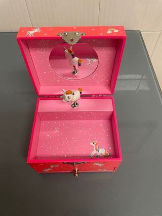 Precioso joyero musical con un diseño de unicornio y varios animalitos. - Unicornio blanco con crin arcoíris. - Incluye un pequeño arcoíris. - Decorado con estrellas doradas.
