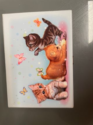 Precioso joyero musical con un diseño encantador de gatitos y mariposas. - Ilustración de gatitos jugando. - Detalles de mariposas coloridas. - Fondo con toques de brillo.