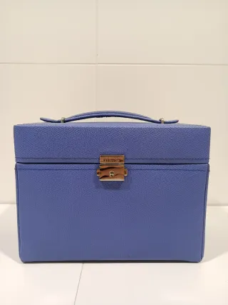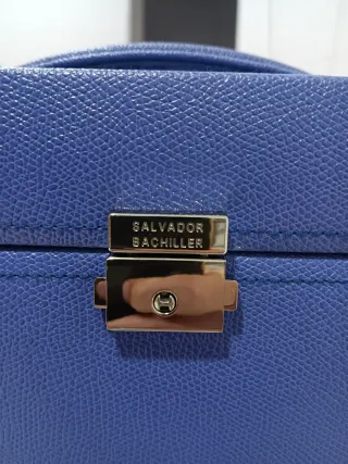Elegante joyero de piel de la marca Salvador Bachiller. - Color azul con detalles dorados. - Asa superior para facilitar su transporte. - Cierre metálico frontal. Trae numerosos compartimentos para guardar todo tipo de joyas, incluido para guardar relojes. Viene acompañado de un espejo. El color azul del joyero, lo hace único.