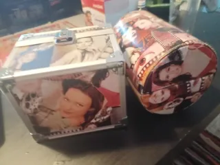 Conjunto de dos joyeros con un diseño único inspirado en el cine y las estrellas. - Un joyero tipo cofre con asa metálica. - Un neceser o bolso con asa. - Decoración con imágenes de actrices y elementos cinematográficos.