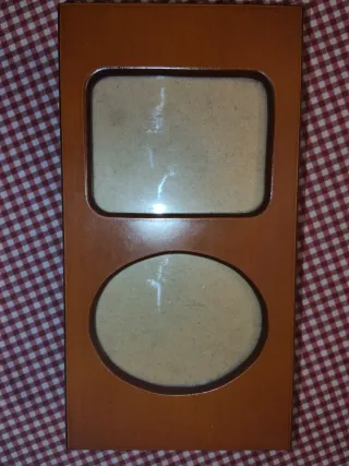 Elegante joyero de madera con un diseño clásico. - Acabado en tono marrón. - Dos compartimentos para fotos, uno rectangular y otro ovalado.