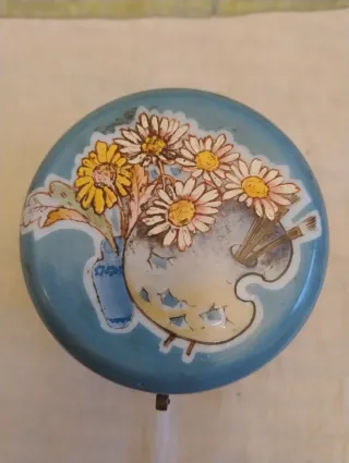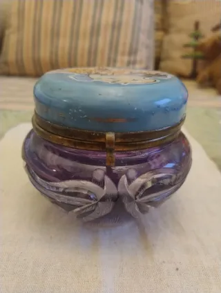 Precioso joyero antiguo con un diseño floral pintado a mano. Ideal para guardar tus tesoros. 12 cm de diámetro y 10 cm de altura. - Material: Cristal. - Decoración: Pintura de flores y paleta de pintor. - Base: Azul claro.