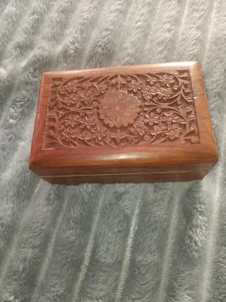 Elegante joyero de madera con un intrincado diseño floral tallado a mano.Alto 6×15.5 ancho×10 fondo - Tapa con motivos florales. - Acabado en madera natural.