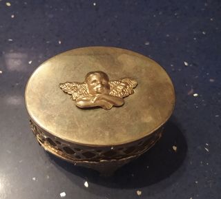 Elegante joyero vintage con un diseño detallado. - Adorno de ángel en la tapa. - Base con patas ornamentadas. - Laterales con patrón calado.