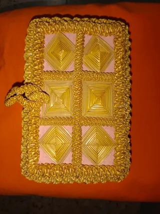 Original joyero artesanal, perfecto para guardar tus tesoros. - Elaborado con paja. - Diseño con compartimentos cuadrados y rombos. - Borde decorativo trenzado.