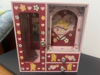Joyero con cajones y música con su bailarina funciona perfectamente y colgador alado de pulseras.etcen buen estado tiene roto el tirador pero eso se pega pero Hase su función.x lo demás todo perfecto tiene aniñero y para poner en cajones cosas.