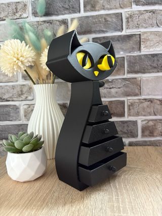 Original joyero con forma de gato negro, ideal para organizar tus accesorios. Fabricado en impresion 3d, se puede hacer en otros colores tambien. - Diseño estilizado de gato. - Cuerpo con varios cajones. - Detalles en color amarillo en ojos y nariz.
