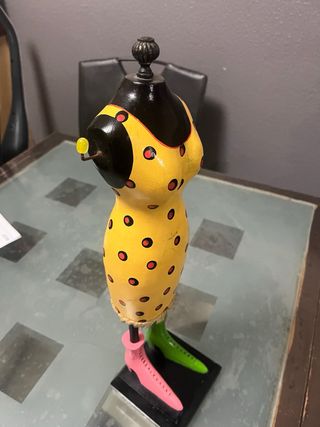 Original joyero decorativo con forma de muñeca. Ideal para dar un toque divertido a tu espacio. - Diseño con lunares rojos y negros. - Base estable. - Brazos con colgadores.