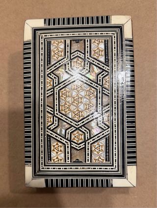Elegante caja joyero de madera, elaborada artesanalmente en Egipto. Presenta un intrincado diseño geométrico con incrustaciones de nácar y detalles en tonos dorados. Medidas 16,5 cm (largo) 10,5 cm (ancho) 6 cm (alto) - Diseño geométrico detallado. - Materiales: Madera, nácar y otros. - Estilo artesanal egipcio. - Interior terciopelo rojo
