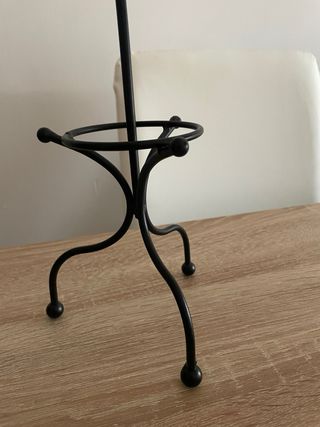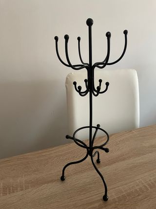 Elegante perchero para organizar tus collares y pulseras. - Diseño de metal negro. - Múltiples ganchos para colgar accesorios. - Base circular estable.