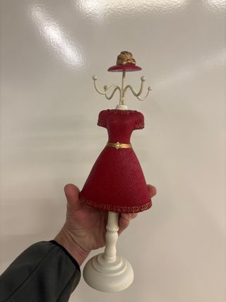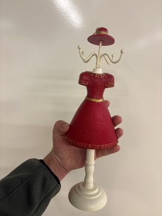 Elegante joyero con forma de vestido, ideal para organizar tus accesorios. - Diseño en forma de vestido. - Detalles dorados en el cinturón y el borde. - Soporte para collares y pulseras.