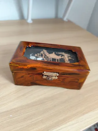 Joyero con un diseño clásico y detalles ornamentales. - Tapa con ventana transparente. - Incrustación decorativa con grullas - Cierre metálico dorado. - Color marrón, el interior forrado color rojo - Medidas 13x7,5x5,5 - Diseño con motivos orientales