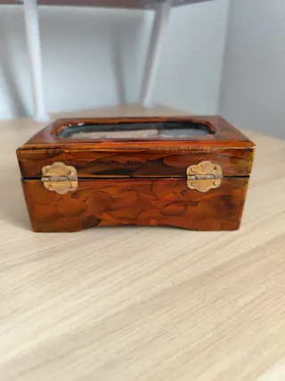 Pequeña cajita/joyero de madera con tapa. Medidas: 19,5×8,5 por 4 cms de alto. Nunca se ha usado, solo ha servido de decoración.
