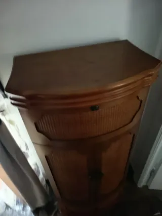 Elegante mueble joyero con un diseño clásico y acabados en madera. - Diseño de esquina. - Paneles de mimbre. - Cajón inferior. - Cerradura superior.