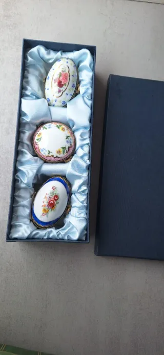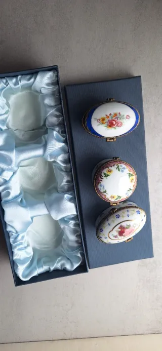 Conjunto de tres delicadas cajas joyeras de cerámica con un diseño vintage. Ideal para guardar joyas o también suele usarse como pastilleros - Cada caja presenta una decoración floral pintada a mano. - Los bordes están adornados con detalles dorados y un ribete azul. - Incluyen un cierre metálico para mantenerlas seguras.