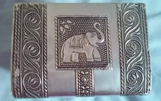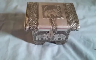 Cofre caja joyero en metal repujado VINTAGE Preciosa caja de joyero de metal. Ideal para guardar tus joyas u otros objetos pequeños. - Diseño con elefantes grabados. - Acabado elegante y detallado. - Perfecto para regalo o uso personal Grabados con motivos indios: elefantes, flores... Forrado en terciopelo azul. Mide 9,5 x 13 cms. x 10,5 cms de alto Esta perfecto. Recogida en Málaga capital no hago envíos