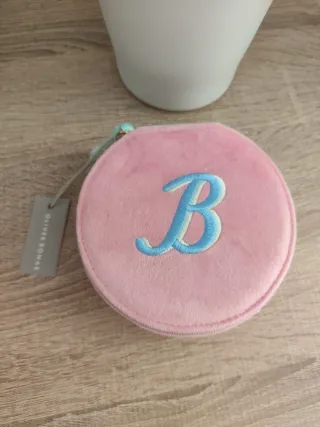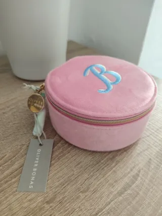 Elegante joyero redondo de terciopelo rosa de Oliver Bonas. Presenta un diseño encantador con la inicial B bordada en azul. Nuevo, sin estrenar, con etiqueta. Fue comprado para regalo en un viaje a Londres, pero se regaló otra cosa. - Material: Terciopelo suave. - Color: Rosa. - Diseño: Redondo con inicial B bordada. - Marca: Oliver Bonas. - Ideal para viajar y llevar tus joyas contigo en éste elegante joyero portátil.