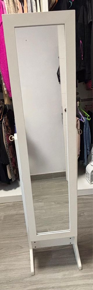 Espejo de pie con marco blanco, ideal para organizar tus accesorios. - Diseño elegante y funcional. - Amplia superficie de espejo. - Estructura estable con patas.