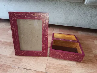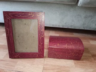 Conjunto de marco para fotos 18x13 y joyero con un diseño decorativo. - Marco de estilo vintage con acabado craquelado. - Joyero con tapa curva y acabado a juego.