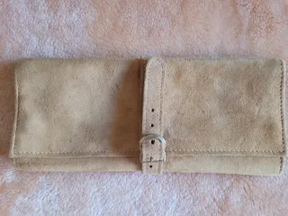 Joyero de viaje vintage de tela tipo ante en color marrón claro. Hecho en Inglaterra 🇬🇧 Muy práctico para guardar anillos, pendientes y pequeñas joyas cuando viajas. Interior con: • 2 bolsillos con cremallera (uno más profundo). • Cordón con enganche para anillos. • 3 compartimentos individuales con cierre • Cierre exterior con correa. Medidas cerrado aprox.: 22 x 10 cm. Tiene muchos años, con señales normales del paso del tiempo y pequeñas marcas en el tejido (ver bien las fotos) pero conserva todo su encanto vintage ✨ El color puede verse más claro u oscuro según la luz. Hago lotes.