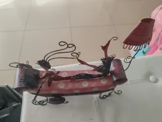 Original joyero diseñado para guardar anillos y pulseras. Su forma evoca a una mujer descansando. - Estructura metálica con detalles pintados. - Base con diseño de lunares rosas y blancos. - Figuras de alambre con adornos.