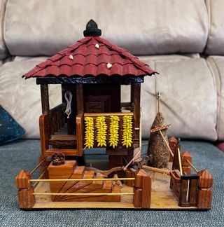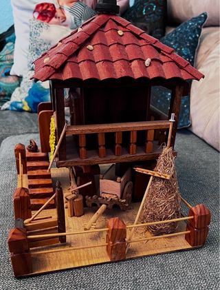 Bonito horreo joyero de madera, ideal para guardar tus tesoros. 30,5 cm x 25 cm x 30,5 - Hecho a mano, único. - Diseño tradicional de horreo. - Detalles en madera oscura y tejado rojo. - Incluye pequeños adornos decorativos.