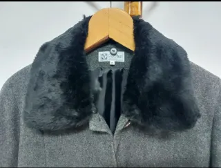 Elegante chaquetón de paño en color gris. Cuenta con un distintivo cuello de pelo sintético. Talla 46. - Cierre de botones. - Bolsillos frontales. - Puños doblados.