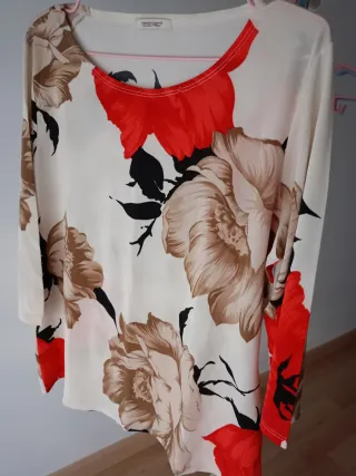 Camiseta de manga larga con un llamativo estampado floral. - Diseño con flores grandes en tonos beige y rojo. - Cuello redondo con detalle en rojo. - Tejido ligero y cómodo.