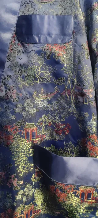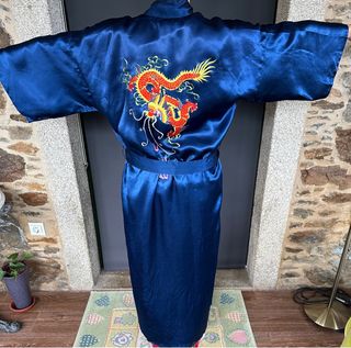 Elegante kimono de estilo chino con un intrincado estampado de dragones y flores. TALLA XXL-XXXL. EN BUEN ESTADO. - Tejido satinado con caída. - Bolsillos frontales. SE PUEDE VER Y PROBAR SIN COMPROMISO. ME DESPLAZO A LAS PALMAS, TELDE Y MASPALOMAS HAGO ENVÍOS POR CORREOS, PRECIO: 6 EUROS
