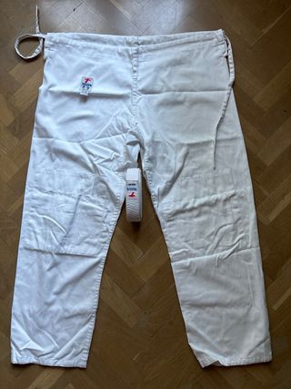 Kimono de judo completo, listo para entrenar o competir. Incluye pantalón y cinturón. Talla 000. Muy poco uso. - Kimono de judo. - Pantalón de judo. - Cinturón blanco.