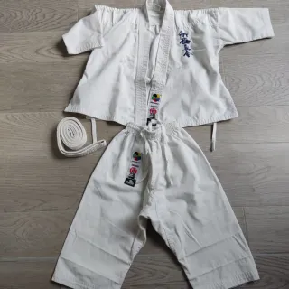 Traje de karate completo, ideal para entrenamientos y competiciones. - Incluye chaqueta y pantalón. - Cinturón blanco incluido. - Tejido resistente y cómodo. - para Niñ@s de unos 4/5 años