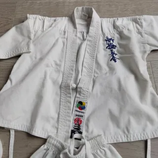 Kimono de karate para niño, ideal para entrenamientos y competiciones. - Chaqueta y pantalón. - Cierre con cordón en el pantalón. - Tejido resistente. - Está sin estrenar, porque le queda grande al peque.