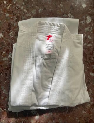 Kimono de karate de color blanco. Ideal para la práctica de artes marciales. - Tejido resistente y duradero. - Diseño tradicional. - Talla: 1’40 (Falta planchar)